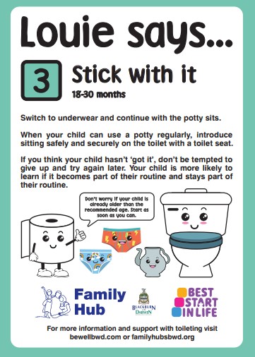 Blackburn with Darwen Public Health have created a new campaign called 'Louie says'. This is an easy to follow, 3 step programme designed for families to help take the step to your child being toilet trained. All of our staff are trained on this campaign and can support you on your journey. We have free booklets available in nursery for you to take away to help you get started. We also link with the Family Hub team at Livesey who provide toileting sessions for parents to attend. These sessions follow the advice and guidance within the 'Louie says' campaign. Health Visitors are also available to support you if you need it. Together, we can help every child achieve the milestone of toileting before they start nursery. The approach is fun and accessible to everyone. Follow the link to find out more Louie Says ... - Be Well BWD or speak to your child's Key Person.